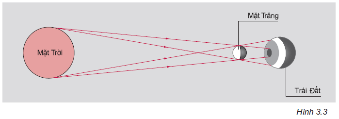 - Khi Mặt Trăng nằm giữa Mặt Trời và Trái Đất thì một phần ánh sáng từ Mặt Trời chiếu đến Trái Đất sẽ bị Mặt Trăng che khuất. Khi đó trên Trái Đất sẽ xuất hiện bóng tối và bóng nửa tối. Ta nói khi đó xảy ra hiện tượng nhật thực.