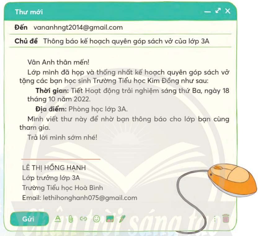 Bạn Hồng Hạnh viết thư cho bạn Vân Anh nhờ thông báo với các bạn lớp Vân Anh về kế hoạch quyên góp sách vở vào tiết Hoạt động trải nghiệm sáng thứ 3 tại phòng học của lớp 3A.