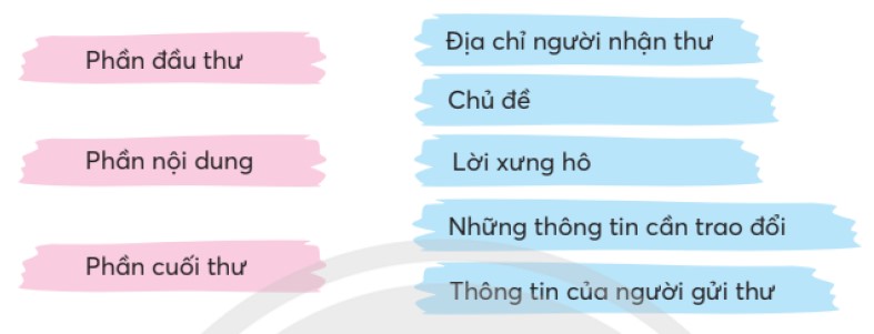 b. Thư có những nội dung gì? Chọn các thẻ màu xanh phù hợp với mỗi thẻ màu hồng: