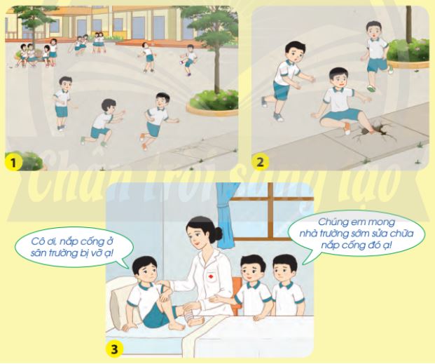 - Nam và các bạn chơi rượt đuổi ở sân trường. Nam bị tai nạn do trượt chân vào chỗ nắp cống bị vỡ. Các bạn đưa Nam đến phòng y tế.