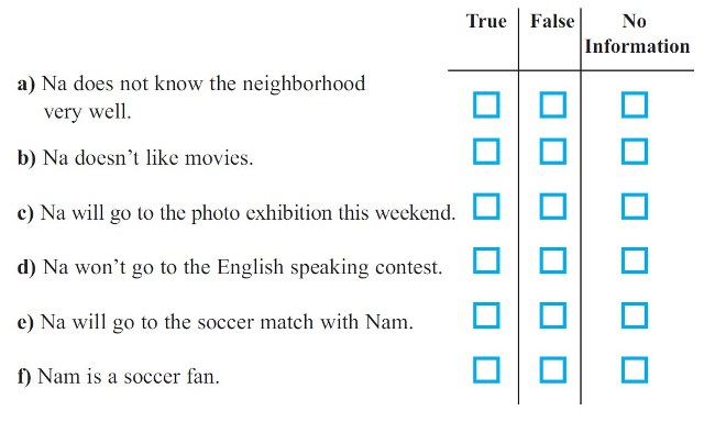2. Hãy nghe lại hội thoại và đánh dấu (✓) vào cột Đúng, Sai hoặc Không có thông tin.